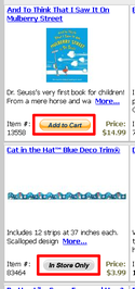 Once you find an item you like, look for the "Add to Cart" button and click it. You are not paying yet, you are simply adding it to your shopping cart like you would at any store before you go to the checkout. If you see "In Store Only" instead, that means we do not sell that item online ... at least not at this time, but we do carry it in store.