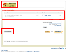 From this page you can either choose to checkout or click the "Continue Shopping" button to close the window and return to your search. Closing the window will NOT affect your cart. The contents should remain until you are ready to check out as long as you continue with the same computer and have cookies** enabled (most people do).